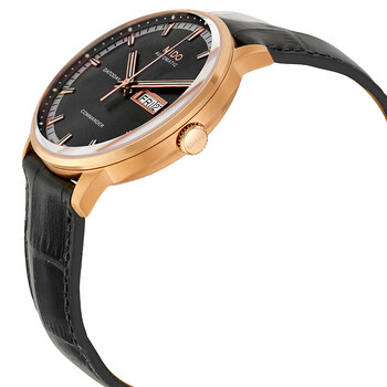 Rose gold PVD stainless steel case with a black crocodile leather strap. Fixed rose gold PVD bezel. Black dial with luminous rose gold-tone hands and index hour markers. Minute markers around the outer rim. Dial Type: Analog. Luminescent hands and markers. Day of the week and date display at the 3 o'clock position. ETA 2836-2 automatic movement with a 40-hour power reserve. Scratch resistant sapphire crystal. Solid case back. Case size: 40 mm. Case thickness: 11 mm. Round case shape. Band width: 20 mm. Tang clasp. Water resistant at 50 meters / 165 feet. Functions: date, day, hour, minute, second. Dress watch style. Watch label: Swiss Made. Mido Commander II Automatic Black Dial Men's Watch M016.430.36.061.02.