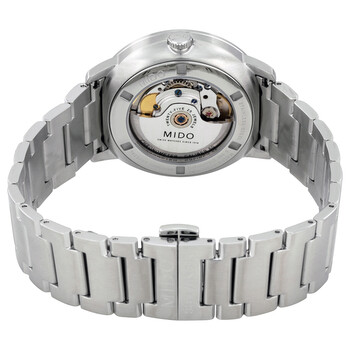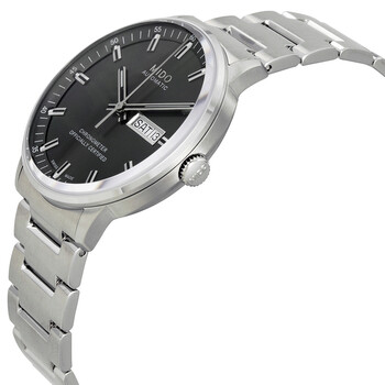 Stainless steel case with a stainless steel bracelet. Fixed stainless steel bezel. Grey dial with luminous silver-tone hands and index hour markers. Arabic numeral minute markers (at 5 minute intervals). Minute markers around the outer rim. Dial Type: Analog. Luminescent hands and markers. Day of the week and date display at the 3 o'clock position. Mido calibre Powermatic 80 (ETA C07.621) automatic movement, based upon ETA 2824-2, containing 23 Jewels, bitting at 21600 vph, and has a power reserve of approximately 80 hours. Scratch resistant sapphire crystal. Skeleton case back. Round case shape. Case size: 40 mm. Case thickness: 11.3 mm. Band width: 20 mm. Fold over clasp with a push button release. Water resistant at 50 meters / 165 feet. Functions: date, day, hour, minute, second, chronometer. Commander II Series. Casual watch style. Watch label: Swiss Made. Mido Commander II Automatic Grey Dial Men's Watch M021.431.11.061.00.