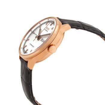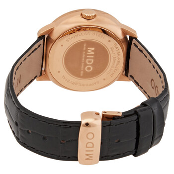 Rose gold PVD stainless steel case with a black leather strap. Fixed rose gold PVD bezel. Silver dial with luminous black hands and index hour markers. Minute markers around the outer rim. Dial Type: Analog. Luminescent hands and markers. Day of the week and date display at the 3 o'clock position. Automatic movement. Scratch resistant sapphire crystal. Pull / push crown. Solid case back. Case size: 33 mm. Case thickness: 10.53 mm. Round case shape. Strap width: 17 mm. Fold over with safety release clasp. Water resistant at 50 meters / 165 feet. Functions: date, day, hour, minute, second. Casual watch style. Mido Commander II Automatic Ladies Watch M016.230.36.031.00.