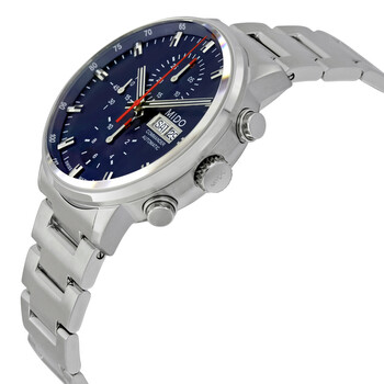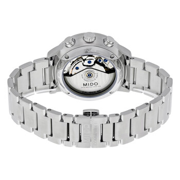 Stainless steel case with a stainless steel bracelet. Fixed stainless steel bezel. Blue dial with luminous silver-tone hands and index hour markers. Minute markers. tachymeter markings around the outer rim. Dial Type: Analog. Luminescent hands and markers. Day of the week and date display at the 3 o'clock position. Chronograph - three sub-dials displaying: 60 second, 30 minute and 12 hours. Mido calibre 60 automatic movement, based upon Valjoux 7753, containing 27 Jewels, bitting at 28800 vph, and has a power reserve of approximately 60 hours. Scratch resistant sapphire crystal. Transparent case back. Round case shape. Case size: 42.5 mm. Case thickness: 14.89 mm. Band width: 22 mm. Fold over clasp with a push button release. Water resistant at 50 meters / 165 feet. Functions: chronograph, date, hour, minute, second, tachymeter. Commander II Series. Luxury watch style. Watch label: Swiss Made. Mido Commander II Chronograph Automatic Men's Watch M016.414.11.041.00.