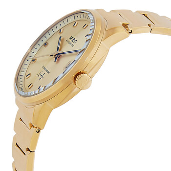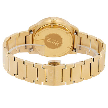 Yellow gold PVD stainless steel case and bracelet. Fixed yellow gold PVD stainless steel bezel. Champagne dial with gold-tone hands and index hour markers. Minute markers around the outer rim. Dial Type: Analog. Date display at the 3 o'clock position. Automatic movement with a 72-hour power reserve. Scratch resistant sapphire crystal. Pull / push crown. Round case shape, case size: 35 mm, case thickness: 9.2 mm. Band width: 19 mm. Folding clasp. Water resistant at 50 meters / 165 feet. Functions: date, hour, minute, second. Commander Lady Series. Casual watch style. Watch label: Swiss Made. Item Variations: M0212073302100. Mido Commander Lady Automatic Champagne Dial Watch M021.207.33.021.00.