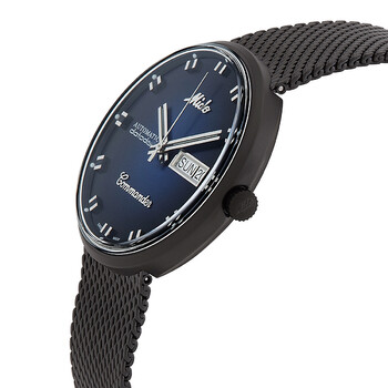 Black PVD stainless steel case and bracelet. Fixed black PVD stainless steel bezel. Blue dial with silver-tone hands and index hour markers. Dial Type: Analog. Day of the week and date display at the 3 o'clock position. Mido Calibre Powermatic 80 (ETA C07.621) Automatic movement, based upon ETA 2824-2, containing 23 Jewels, bitting at 21600 vph, and has a power reserve of approximately 80 hours. Scratch resistant acrylic glass crystal. Solid case back. Round case shape, case size: 37 mm, case thickness: 10.5 mm. Sliding clasp. Water resistant at 50 meters / 165 feet. Functions: date, day, hour, minute, second. Commander Series. Casual watch style. Watch label: Swiss Made. Mido Commander Shade Automatic Blue Dial Men's Watch M842932511.