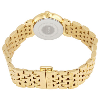 Yellow gold-tone stainless steel case and bracelet. Fixed yellow gold-tone bezel. Gold dial with yellow gold-tone hands and index hour markers. Dial Type: Analog. Date display at the 3 o'clock position. ETA Caliber 956.112 quartz movement. Scratch resistant sapphire crystal. Pull / push crown. Solid case back. Round case shape. Case size: 25 mm. Case thickness: 5.8 mm. Band width: 14 mm. Fold over clasp with a push button release. Water resistant at 30 meters / 100 feet. Functions: date, hour, minute, second. Dorada Series. Dress watch style. Watch label: Swiss Made. Mido Dorada Gold Dial Yellow Gold-tone Ladies Watch M2130.3.12.1.