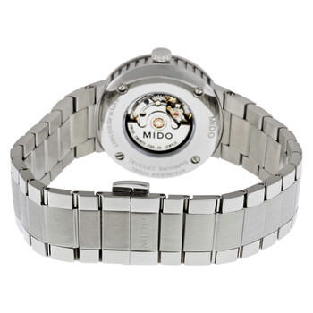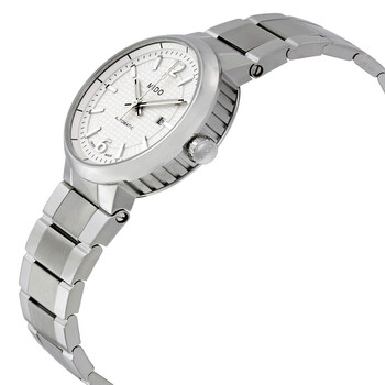 Stainless steel case with a stainless steel bracelet. Fixed stainless steel bezel. Silver dial with silver-tone hands and index hour markers. Arabic numerals mark the 6 and 12 o'clock positions. Minute markers around the outer rim. Dial Type: Analog. Luminescent hands and markers. Date display at the 3 o'clock position. ETA 2678 automatic movement with a 38-hour power reserve. Scratch resistant sapphire crystal. Transparent case back. Case size: 31 mm. Case thickness: 9.55 mm. Round case shape. Band width: 9 mm. Fold over clasp. Water resistant at 50 meters / 165 feet. Functions: date, hour, minute, second. Dress watch style. Watch label: Swiss Made. Mido Great Wall Automatic Ladies Watch M017.230.11.037.00.