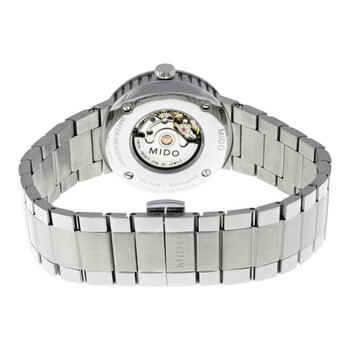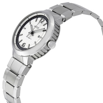 Stainless steel case with a stainless steel bracelet. Fixed stainless steel bezel. Silver dial with black hands and index hour markers. Arabic numerals mark the 6 and 12 o'clock positions. Minute markers around the outer rim. Dial Type: Analog. Luminescent hands and markers. Date display at the 3 o'clock position. ETA 2678 automatic movement with a 38-hour power reserve. Scratch resistant sapphire crystal. Pull / push crown. Transparent case back. Case size: 31 mm. Case thickness: 9.55 mm. Round case shape. Band width: 9 mm. Fold over clasp. Water resistant at 50 meters / 165 feet. Functions: date, hour, minute, second. Dress watch style. Watch label: Swiss Made. Mido Great Wall Automatic Ladies Watch M017.230.11.037.09.