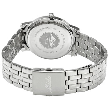 Silver-tone stainless steel case and bracelet. White dial with silver-tone hands and index hour markers. Minute markers around the outer rim. Dial Type: Analog. Luminescent hands and markers. Date display at the 3 o'clock position. ETA Caliber 956.112 quartz movement. Scratch resistant sapphire crystal. Solid case back. Round case shape, case size: 40 mm. Fold over clasp with a safety release. Water resistant at 50 meters / 165 feet. Functions: date, hour, minute, second. Madison Series. Dress watch style. Watch label: Swiss Made. Mido Madison Quartz White Dial Men's Watch M2966.4.16.1.