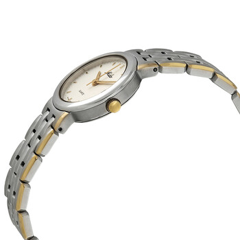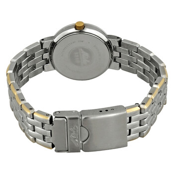 Stainless steel case with a two-tone (silver-tone and gold ion-plated) stainless steel bracelet. Fixed stainless steel bezel. White dial with gold-tone hands and index hour markers. Minute markers around the outer rim. Dial Type: Analog. Date display at the 3 o'clock position. Quartz movement. Scratch resistant sapphire crystal. Pull / push crown. Solid case back. Round case shape. Case size: 34 mm. Band width: 15 mm. Fold over clasp. Water resistant at 30 meters / 100 feet. Functions: date, hour, minute, second. Madison Series. Casual watch style. Watch label: Swiss Made. Mido Madison White Dial Two-tone Ladies Watch M2465.9.16.1.
