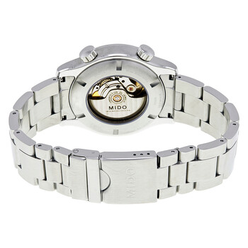Silver-tone stainless steel case with a silver-tone stainless steel bracelet. Fixed outer, rotating inner black stainless steel bezel. Anthracite dial with luminous silver-tone hands and dot hour markers. Arabic numeral appears at the 12 o'clock position. minute markers around the outer rim. Dial Type: Analog. Luminescent hands and markers. Day of the week and date display at the 3 o'clock position. Mido Calibre Powermatic 80 (ETA C07.621) Automatic movement, based upon ETA 2824-2, containing 23 Jewels, bitting at 21600 vph, and has a power reserve of approximately 80 hours. Scratch resistant sapphire crystal. Screw down crown. Transparent case back. Round case shape, case size: 42 mm, case thickness: 11.75 mm. Band width: 22 mm. Deployment with push button release clasp. Water resistant at 200 meters / 660 feet. Functions: date, day, hour, minute, second. Multifort Series. Casual watch style. Watch label: Swiss Made. Mido Multifort Automatic Anthracite Dial Men's Watch M005.930.11.060.80.