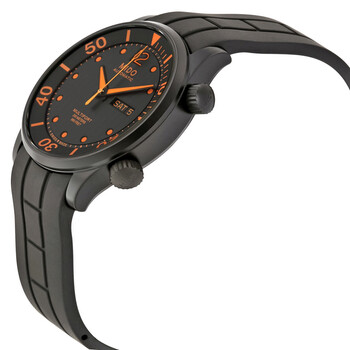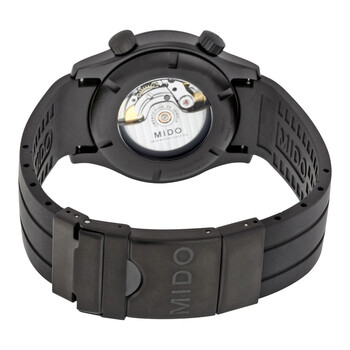 Black PVD stainless steel case with a black rubber strap. Fixed black PVD bezel. Black dial with orange hands and dot hour markers. An Arabic numeral appears at the 12 o'clock position. Minute markers. Dial Type: Analog. Luminescent hands and markers. Day of the week and date display at the 3 position. Automatic movement. Scratch resistant sapphire crystal. Transparent case back. Case size: 42 mm. Case thickness: 11.75 mm. Round case shape. Band width: 22 mm. Fold over clasp. Water resistant at 200 meters / 660 feet. Functions: date, day, hour, minute, second. Sport watch style. Watch label: Swiss Made. Mido Multifort Automatic Black Dial Men's Watch M005.930.37.050.80.