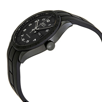 Back PVD stainless steel case with a black rubber strap. Back PVD bezel. Black dial with luminous black hands and index / Arabic numeral hour markers. Minute markers around the outer rim. Dial Type: Analog. Luminescent hands. Day of the week and date display at the 3 o'clock position. Automatic movement with an 80-hour power reserve. Scratch resistant sapphire crystal. Screw down crown. Transparent case back. Case size: 42 mm. Case thickness: 11.25 mm. Round case shape. Band width: 25 mm. Fold over clasp. Water resistant at 100 meters / 330 feet. Functions: date, day, hour, minute, second. Dress watch style. Watch label: Swiss Made. Mido Multifort Automatic Black Dial Men's Watch M018.430.37.052.80.