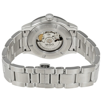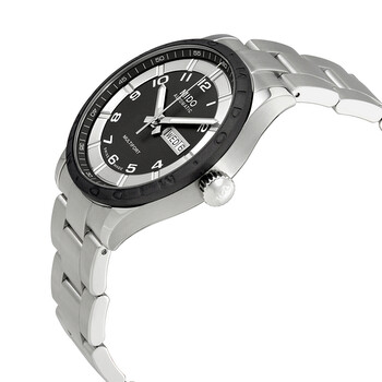 Stainless steel case with a stainless steel bracelet. Fixed stainless steel bezel with a black top ring. Black dial with silver-tone hands and index / Arabic numeral hour markers. Minute markers around the outer rim. Dial Type: Analog. Luminescent hands and markers. Day of the week and date display at the 3 o'clock position. Automatic movement. Scratch resistant sapphire crystal. Screw down crown. Transparent case back. Case size: 42 mm. Case thickness: 11 mm. Round case shape. Band width: 25 mm. Deployment clasp. Water resistant at 100 meters / 330 feet. Functions: date, day, hour, minute, second. Dress watch style. Watch label: Swiss Made. Mido Multifort Automatic Black Dial Men's Watch M0184301106200