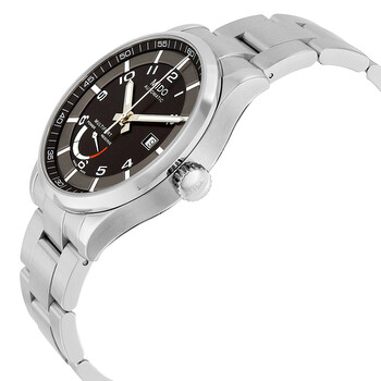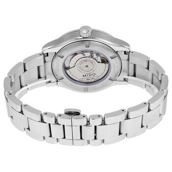 Stainless steel case with a stainless steel bracelet. Fixed stainless steel bezel. Black and silver dial with luminous silver-tone hands and Arabic numeral / index hour markers. Minute markers around the outer rim. Dial Type: Analog. Luminescent hands and markers. Date display at the 3 o'clock position. Power reserve indicator at the 7 o'clock position. Automatic movement with a 42 hour power reserve. Scratch resistant sapphire crystal. Screw down crown. Skeleton case back. Case diameter: 42 mm. Case thickness: 11 mm. Round case shape. Band width: 21 mm. Deployment clasp. Water resistant at 100 meters / 330 feet. Casual watch style. Mido Multifort Automatic Black Dial Stainless Steel Men's Watch M0054241105202.