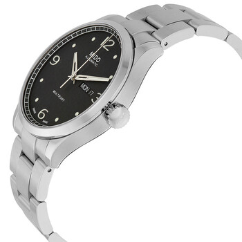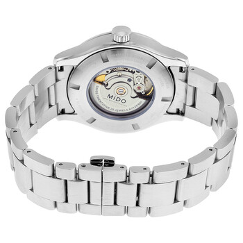 Stainless steel case with a stainless steel bracelet. Fixed stainless steel bezel. Black dial with luminous silver-tone hands and dot hour markers. Arabic numerals mark the 3, 6, 9 and 12 o'clock positions. Minute markers around the outer rim. Dial Type: Analog. Luminescent hands. Day of the week and date display at the 3 o'clock position. Automatic movement with a 38 hour power reserve. Scratch resistant sapphire crystal. Screw down crown. Transparent case back. Case diameter: 42 mm. Case thickness: 10.45 mm. Round case shape. Band width: 21 mm. Deployment clasp. Water resistant at 100 meters / 330 feet. Functions: date, day, hour, minute, second. Casual watch style. Mido Multifort Automatic Black Dial Stainless Steel Men's Watch M0054301105000.