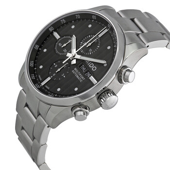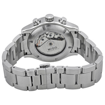 Stainless steel case with a stainless steel bracelet. Fixed stainless steel bezel. Dark grey dial with luminous silver-tone hands and dot hour markers. Minute markers. Tachymeter around the outer rim. Dial Type: Analog. Luminescent hands and markers. Day of the week and date display at the 3 o'clock position. Chronograph - three sub-dials displaying: 60 second, 30 minute and 12 hour. Mido calibre 1320 automatic movement, based upon Valjoux 7750, containing 25 Jewels, bitting at 28800 vph, and has a power reserve of approximately 48 hours. Scratch resistant sapphire crystal. Screw down crown. Transparent case back. Round case shape. Case size: 44 mm. Case thickness: 14.5 mm. Band width: 22 mm. Deployment clasp. Water resistant at 100 meters / 330 feet. Functions: chronograph, tachymeter, date, day, hour, minute, second. Multifort Series. Casual watch style. Watch label: Swiss Made. Item Variations: M005 614 11 061 00, M005-614-11-061-00, M005/614/11/061/00, M0056141106100. Mido Multifort Automatic Chronograph Men's Watch M0056141106100.