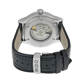 Silver-tone stainless steel case with a black leather strap. Fixed silver-tone stainless steel bezel. White dial with silver-tone hands and dot hour markers. Minute markers. tachymeter around the outer rim. Dial Type: Analog. Day of the week and date display at the 3 o'clock position. ETA Caliber 2836-2 Automatic movement, based upon ETA 2824-2, containing 25 Jewels, bitting at 28800 vph, and has a power reserve of approximately 40 hours. Scratch resistant sapphire crystal. Skeleton case back. Round case shape, case size: 42 mm. Fold over clasp. Water resistant at 100 meters / 330 feet. Functions: date, day, hour, minute, second. Multifort Series. Casual watch style. Watch label: Swiss Made. Item Variations: M005 430 16 032 00, M005-430-16-032-00, M005/430/16/032/00, M0054301603200. Mido Multifort Automatic White Dial Leather Men's Watch M0054301603200.