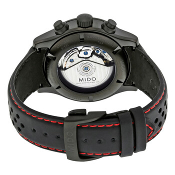 Black PVD stainless steel case with a black leather strap with red stitching. Fixed black PVD bezel showing tachymeter markings. Black dial with luminous grey hands and dot hour markers. Arabic numerals appears at the 12 o'clock position. . Minute markers around the outer rim. Dial Type: Analog. Luminescent hands and markers. Date display at the 6 o'clock position. Chronograph - two sub-dials displaying: 60 second and 30 minute. Calibre 60.A05H31 automatic movement with a 60 hour power reserve. Scratch resistant sapphire crystal. Screw down crown. Transparent case back. Case size: 44 mm. Case thickness: 14.70 mm. Round case shape. Band width: 23 mm. Deployment clasp. Water resistant at 100 meters / 330 feet. Functions: chronograph, tachymeter, date, hour, minute, second. Luxury watch style. Watch label: Swiss Made. Mido Multifort Chronograph Automatic Men's Watch M025.627.36.061.00.