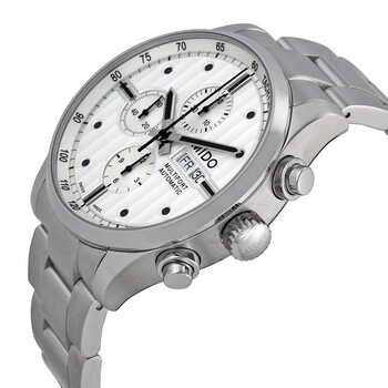 Silver-tone stainless steel case with a silver-tone stainless steel bracelet. Fixed silver-tone stainless steel bezel. Silver dial with silver-tone hands and dot hour markers. Minute markers. tachymeter around the outer rim. Dial Type: Analog. Luminescent hands and markers. Day of the week and date display at the 3 o'clock position. Chronograph - three sub-dials displaying: 60 second, 30 minute and 12 hour. Mido Calibre 1320 Automatic movement, based upon Valjoux 7750, containing 25 Jewels, bitting at 28800 vph, and has a power reserve of approximately 48 hours. Scratch resistant sapphire crystal. Screw down crown. Skeleton case back. Round case shape, case size: 44 mm, case thickness: 14.5 mm. Band width: 22 mm. Deployment clasp. Water resistant at 100 meters / 330 feet. Functions: chronograph, tachymeter, date, day, hour, minute, second. Multifort Series. Casual watch style. Watch label: Swiss Made. Item Variations: M005 614 11 031 00, M005-614-11-031-00, M005/614/11/031/00, M0056141103100. Mido Multifort Chronograph Silver Dial Stainless Steel Men's Watch M0056141103100.