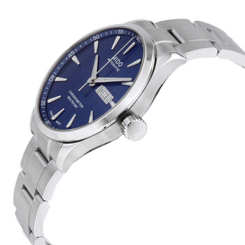 Stainless steel case with a stainless steel bracelet. Fixed stainless steel bezel. Blue dial with luminous silver-tone hands and index hour markers. Minute markers around the outer rim. Dial Type: Analog. Luminescent hands and markers. Day of the week and date display at the 3 o'clock position. Mido caliber 80 COSC Si (base ETA C07.821) automatic movement with an 80-hour power reserve. Scratch resistant sapphire crystal. Screw down crown. Transparent case back. Round case shape. Case size: 42 mm. Case thickness: 11.99 mm. Band width: 22 mm. Fold over clasp with a push button release. Water resistant at 100 meters / 330 feet. Functions: date, day, hour, minute, second. Multifort Chronometer Series. Casual watch style. Watch label: Swiss Made. Mido Multifort Chronometer Automatic Blue Dial Men's Watch M038.431.11.041.00.