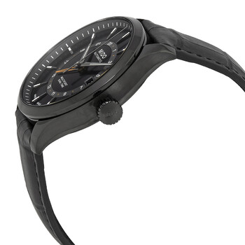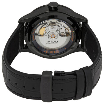 Black PVD stainless steel case with a black (croco-embossed) leather strap. Fixed black PVD bezel. Black dial with luminous black hands and index hour markers. 24 hour markers. Minute markers around the outer rim. Dial Type: Analog. Luminescent hands and markers. Date display at the 3 o'clock position. Mido calibre 80 (base ETA C07.661) automatic movement, containing 25 Jewels, bitting at 21600 vph, and has a power reserve of approximately 80 hours. Scratch resistant sapphire crystal. Transparent case back. Round case shape. Case size: 42 mm. Case thickness: 13.5 mm. Band width: 22 mm. Deployment clasp. Water resistant at 100 meters / 330 feet. Functions: date,GMT, second time zone, hour, minute, second. Multifort Dual Time Series. Casual watch style. Watch label: Swiss Made. Mido Multifort Dual Time Automatic Black Dial Men's Watch M0384293605100.