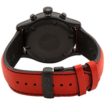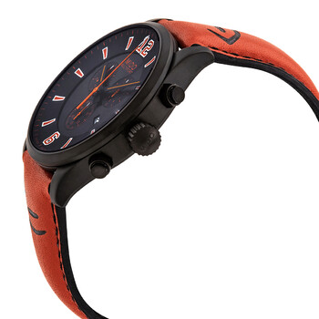 Black PVD stainless steel case with a orange leather strap. Fixed black PVD bezel. Black dial with black and orange hands and index hour markers. Arabic numerala mark the 6 and 12 o'clock positions. Minute markers around the outer rim. Dial Type: Analog. Luminescent hands and markers. Date display at the 4 o'clock position. ETA caliber G15.211 quartz movement. Scratch resistant sapphire crystal. Solid case back. Round case shape. Case size: 42 mm. Case thickness: 10.8 mm. Band width: 20 mm. Water resistant at 100 meters / 330 feet. Functions: chronograph, date, hour, minute, second. Multifort Touchdown Series. Sport watch style. Watch label: Swiss Made. Mido Multifort Touchdown Chronograph Quartz Black Dial Men's Watch M0054173705000.