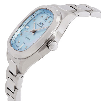Silver-tone stainless steel case and bracelet. Fixed silver-tone stainless steel bezel. Blue mother of pearl dial with silver-tone hands and diamond hour markers. Minute markers around the outer rim. Dial Type: Analog. Date display at the 12 o'clock position. Automatic movement with a 72-hour power reserve. Scratch resistant sapphire crystal. Solid case back. Case size: 35 x 34.2 mm, case thickness: 9.3 mm. Band width: 18 mm. Folding clasp. Water resistant at 100 meters / 330 feet. Functions: date, hour, minute, second. Multifort Tv Series. Casual watch style. Watch label: Swiss Made. Mido Multifort TV Automatic Diamond Watch M0493071113600.