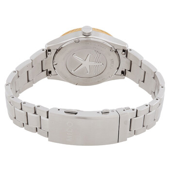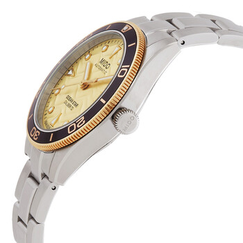 Silver-tone stainless steel case and bracelet. Uni-directional rotating yellow gold PVD stainless steel bezel with a black ceramic insert. Champagne dial with index hour markers. Minute markers around the outer rim. Dial Type: Analog. Luminescent hands and markers. Date display at the 3 o'clock position. Automatic movement with a 72-hour power reserve. Scratch resistant sapphire crystal. Screw down crown. Solid case back. Round case shape, case size: 39 mm, case thickness: 10.5 mm. Band width: 20 mm. Fold over clasp with a safety release. Water resistant at 200 meters / 660 feet. Functions: date, hour, minute, second. Ocean Star Series. Casual watch style. Watch label: Swiss Made. Item Variations: M0269072102100. Mido Ocean Star 39 Automatic Champagne Dial Watch M026.907.21.021.00.