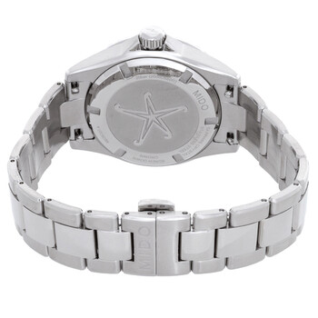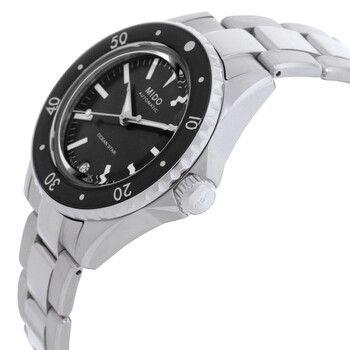 Silver-tone stainless steel case and bracelet. Uni-directional rotating black stainless steel bezel. Black dial with silver-tone hands and index hour markers. Minute markers around the outer rim. Dial Type: Analog. Date display at the 6 o'clock position. Automatic movement with an 80-hour power reserve. Scratch resistant sapphire crystal. Screw down crown. Solid case back. Round case shape, case size: 36.5 mm, case thickness: 12.3 mm. Band width: 18 mm. Folding clasp. Water resistant at 200 meters / 660 feet. Functions: date, hour, minute, second. Ocean Star Series. Watch label: Swiss Made. Mido Ocean Star Automatic Black Dial Ladies Watch M0262071105100.
