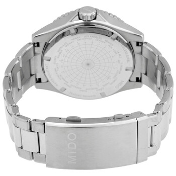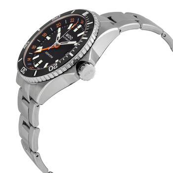 Silver-tone stainless steel case and bracelet. Uni-directional rotating black ceramic bezel. Black dial with silver-tone hands and index hour markers. Minute markers around the outer rim. Dial Type: Analog. Luminescent hands and markers. Date display at the 3 o'clock position. Mido Calibre 80 (base ETA C07.661) Automatic movement, containing 25 Jewels, bitting at 21600 vph, and has a power reserve of approximately 80 hours. Scratch resistant sapphire crystal. Screw down crown. Solid case back. Round case shape, case size: 44 mm, case thickness: 13.3 mm. Band width: 22 mm. Fold over clasp with a safety release. Water resistant at 200 meters / 660 feet. Functions: date, GMT, second time zone, hour, minute, second. Ocean Star Series. Sport watch style. Watch label: Swiss Made. Mido Ocean Star Automatic Black Dial Men's Watch M0266291105101.