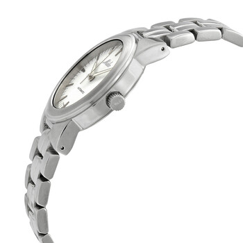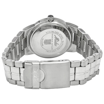 Silver-tone stainless steel case and bracelet. White dial with silver-tone hands and index hour markers. Minute markers around the outer rim. Dial Type: Analog. Luminescent hands. Date display at the 3 o'clock position. Automatic movement. Scratch resistant sapphire crystal. Solid case back. Round case shape, case size: 38 mm. Fold over clasp with a safety release. Functions: date, hour, minute, second. Ocean Star Series. Dress watch style. Watch label: Swiss Made. Mido Ocean Star Automatic White Dial Ladies Watch M8150.4.16.1.