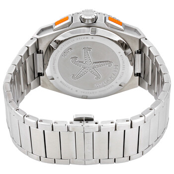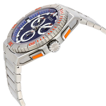 Stainless steel case with a stainless steel bracelet. Uni-directional rotating stainless steel bezel. Blue dial with luminous silver-tone hands and index hour markers. Minute markers around the outer rim. Dial Type: Analog. Luminescent hands and markers. Date display at the 4 o'clock position. Chronograph - three sub-dials displaying: 60 second, 30 minute and 1/10th of a second. Quartz movement. Scratch resistant sapphire crystal. Screw down crown. Solid case back. Case size: 44 mm. Case thickness: 13.21 mm. Round case shape. Band width: 15 mm. Deployment clasp. Water resistant at 200 meters / 660 feet. Functions: chronograph, date, hour, minute, second. Casual watch style. Mido Ocean Star Captain Chronograph Men's Watch M023.417.11.041.00