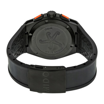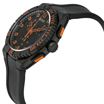 Black PVD stainless steel case with a black rubber strap. Uni-directional rotating black PVD bezel. Black dial with luminous orange hands and index hour markers. Minute markers around the outer rim. Dial Type: Analog. Luminescent hands and markers. Date display at the 4 o'clock position. Chronograph - three sub-dials displaying:60 second, 30 minute and 1/10th of a second. ETA caliber G10.211 quartz movement. Scratch resistant sapphire crystal. Screw down crown. Solid case back. Round case shape. Case size: 44 mm. Case thickness: 13.21 mm. Band width: 15 mm. Fold over clasp. Water resistant at 200 meters / 660 feet. Functions: chronograph, date, hour, minute, second. Sport watch style. Watch label: Swiss Made. Mido Ocean Star Captain Chronograph Men's Watch M023.417.37.051.09.