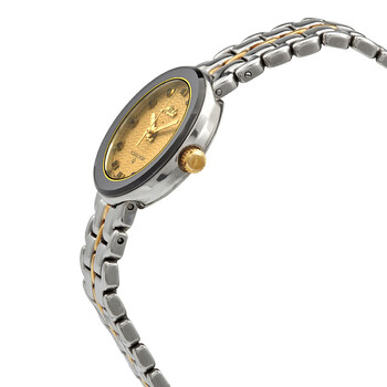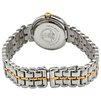 Silver-tone stainless steel case with a two-tone (silver-tone and gold-tone) stainless steel bracelet. Gold dial with gold-tone hands and index hour markers. Dial Type: Analog. Quartz movement. Scratch resistant sapphire crystal. Pull / push crown. Solid case back. Round case shape, case size: 24 mm. Water resistant at 30 meters / 100 feet. Functions: hour, minute, second. Ocean Star Series. Dress watch style. Watch label: Swiss Made. Mido Ocean Star Quartz Gold Dial Ladies Watch M2224.4.26.1.