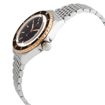 Silver-tone stainless steel with rose gold PVD coating case with a silver-tone stainless steel bracelet. Uni-directional rotating black bezel. Black dial with rose-gold tone and white hands and index hour markers. Minute markers around the outer rim. Dial Type: Analog. Luminescent hands and markers. Day date display at the 3 o'clock position. Mido Caliber 80 (base ETA C07.621) automatic movement. Scratch resistant sapphire crystal. Solid case back. Round case shape, case size: 40.5 mm, case thickness: 13.4 mm. Band width: 21 mm. Fold over clasp with a safety release. Water resistant at 200 meters / 660 feet. Functions: date, day, hour, minute, second. Ocean Star Series. Watch label: Swiss Made. Mido Ocean Star Tribute Automatic Black Dial Men's Watch M0268302105100.