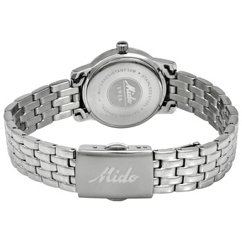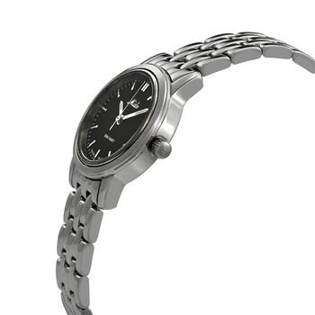 Silver-tone stainless steel case and bracelet. Black dial with silver-tone hands and index hour markers. Minute markers around the outer rim. Dial Type: Analog. Luminescent hands and markers. Date display at the 3 o'clock position. Quartz movement. Scratch resistant sapphire crystal. Pull / push crown. Solid case back. Round case shape, case size: 25.2 mm. Fold over clasp with a safety release. Water resistant at 50 meters / 165 feet. Functions: date, hour, minute, second. Dress watch style. Watch label: Swiss Made. Mido Quartz Black Dial Ladies Watch M2466.4.18.1.