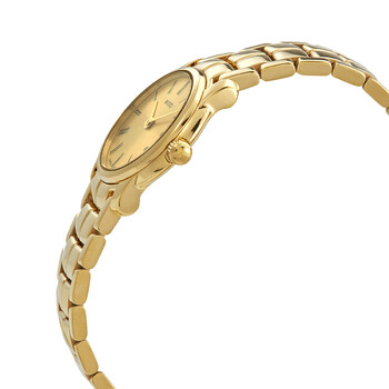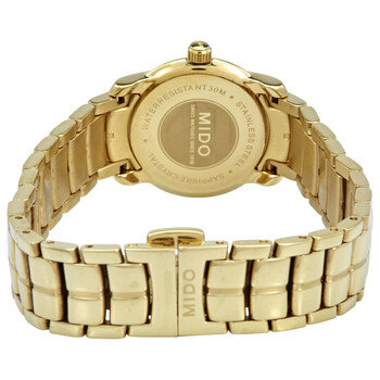 Gold-tone stainless steel case and bracelet. Fixed gold-tone bezel. Champagne dial with gold-tone hands and Roman numeral hour markers. Dial Type: Analog. Quartz movement. Scratch resistant sapphire crystal. Pull / push crown. Solid case back. Round case shape. Case size: 26 mm. Fold over clasp with a push button release. Water resistant at 30 meters / 100 feet. Functions: hour, minute. Dress watch style. Watch label: Swiss Made. Mido Quartz Champagne Dial Ladies Watch M7445.3.22.1.