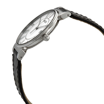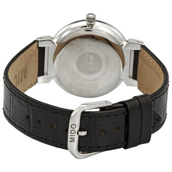 Silver-tone stainless steel case with a black leather strap. White dial with silver-tone hands and Roman numeral hour markers. Minute markers around the inner rim. Dial Type: Analog. Date display at the 3 o'clock position. ETA Caliber 955.412 quartz movement. Scratch resistant sapphire crystal. Pull / push crown. Solid case back. Round case shape, case size: 34 mm. Tang clasp. Water resistant at 30 meters / 100 feet. Functions: date, hour, minute, second, battery eol indicator. Casual watch style. Watch label: Swiss Made. Mido Quartz White Dial Ladies Watch M1130.4.26.4.