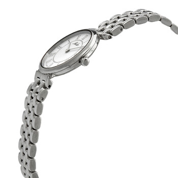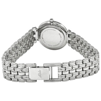 Silver-tone stainless steel case and bracelet. White dial with silver-tone hands and Roman numeral hour markers. Minute markers around the inner rim. Dial Type: Analog. Quartz movement. Scratch resistant sapphire crystal. Pull / push crown. Solid case back. Round case shape, case size: 24.5 mm. Jewelry clasp. Water resistant at 30 meters / 100 feet. Functions: hour, minute. Casual watch style. Watch label: Swiss Made. Mido Quartz White Dial Ladies Watch M2120.4.26.1.