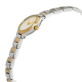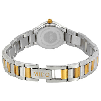 Silver-tone stainless steel case with a two-tone (silver-tone and yellow gold-tone) stainless steel bracelet. Fixed yellow gold-tone stainless steel bezel. White dial with gold-tone hands and index hour markers. Minute markers around the outer rim. Dial Type: Analog. Quartz movement. Pull / push crown. Solid case back. Round case shape. Jewelry clasp. Water resistant at 30 meters / 100 feet. Functions: hour, minute, second. Casual watch style. Watch label: Swiss Made. Mido Quartz White Dial Two-tone Ladies Watch M40449171.