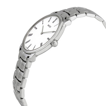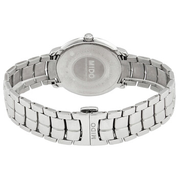 Silver-tone stainless steel case with a two-tone (silver-tone and rose gold-tone) stainless steel bracelet. Fixed rose gold-tone bezel. White dial with rose gold-tone hands and index hour markers. Dial Type: Analog. ETA caliber 955.412 quartz movement. Scratch resistant sapphire crystal. Pull / push crown. Solid case back. Round case shape. Case size: 38 mm. Fold over clasp with a push button release. Water resistant at 30 meters / 100 feet. Functions: hour, minute. Dress watch style. Watch label: Swiss Made. Mido Quartz White Dial Two-tone Men's Watch M8445.4.26.1.
