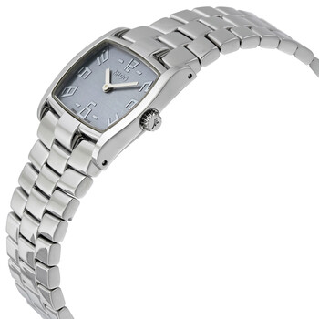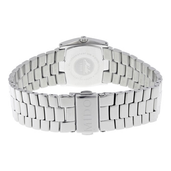 Stainless steel case with a stainless steel bracelet. Fixed stainless steel bezel. Silver dial with silver-tone hands and Arabic numeral hour markers. Dial Type: Analog. ETA 901.001 quartz movement. Scratch resistant sapphire crystal. Pull / push crown. Solid case back. Case dimensions: 30 mm x 31 mm. Square case shape. Water resistant at 30 meters / 100 feet. Functions: hour, minute. Dress watch style. Watch label: Swiss Made. Mido Romantique Ladies Watch M21404311.