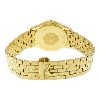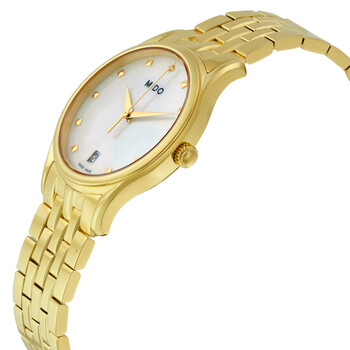 Gold-tone stainless steel case and bracelet. Fixed gold-tone bezel. White mother of pearl dial with gold-tone hands and gold-tone pyramid hour markers. Dial Type: Analog. Date display at the 6 o'clock position. Quartz movement. Scratch resistant sapphire crystal. Pull / push crown. Solid case back. Case size: 31 mm. Case thickness: 6.17 mm. Round case shape. Band width: 16 mm. Water resistant at 30 meters / 100 feet. Functions: date, hour, minute, second. Luxury watch style. Watch label: Swiss Made. Mido Romantique Mother of Pearl Dial Ladies Watch M004.210.33.116.00.