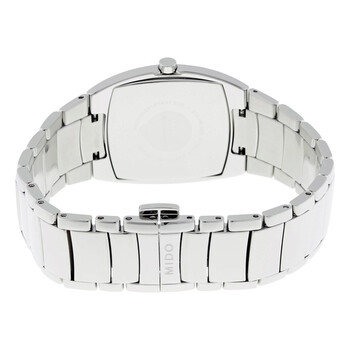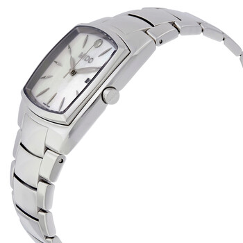 Stainless steel case with a stainless steel bracelet. Fixed stainless steel bezel. White mother of pearl dial with silver-tone hands and index hour markers. Dial Type: Analog. Date display at the 3 o'clock position. Quartz movement. Scratch resistant sapphire crystal. Solid case back. Case dimensions: 30 mm x 31 mm. Case thickness: 7.8 mm. Tonneau case shape. Water resistant at 50 meters / 165 feet. Functions: date, hour, minute, second. Luxury watch style. Watch label: Swiss Made. Mido Romantique Ladies Watch M004.310.11.101.01.