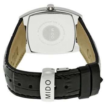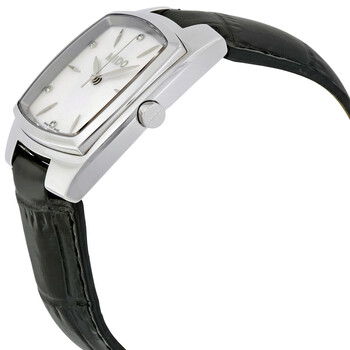 Stainless steel case with a black leather strap. Fixed stainless steel bezel. Moher of pearl dial with silver-tone hands and alternating index and diamond hour markers. Dial Type: Analog. Quartz movement. Scratch resistant sapphire crystal. Pull / push crown. Solid case back. Case dimensions: 30 mm x 31 mm. Case thickness: 7 mm. Tonneau case shape. Band width: 20 mm. Fold over clasp. Water resistant at 50 meters / 165 feet. Functions: hour, minute, second. Luxury watch style. Watch label: Swiss Made. Mido Romantique Mother of Pearl Dial Ladies Watch M004.310.16.116.20.