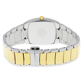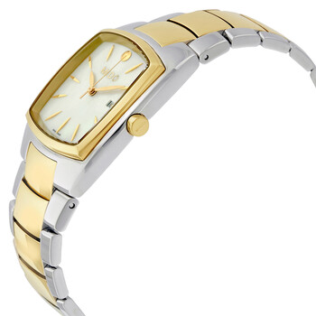 Stainless steel case with a two-tone (silver and yellow gold-tone) stainless steel bracelet. Fixed yellow gold-tone bezel. White mother of pearl dial with yellow gold-tone hands and index hour markers. Dial Type: Analog. Date display at the 3 o'clock position. Quartz movement. Scratch resistant sapphire crystal. Pull / push crown. Solid case back. Tonneau case shape. Case dimensions: 31 mm x 30 mm, case thickness: 7.8 mm. Band width: 20 mm. Fold over clasp. Water resistant at 50 meters / 165 feet. Functions: date, hour, minute, second. Dress watch style. Watch label: Swiss Made. Mido Romantique Mother of Pearl Dial Ladies Watch M004.310.22.101.00.