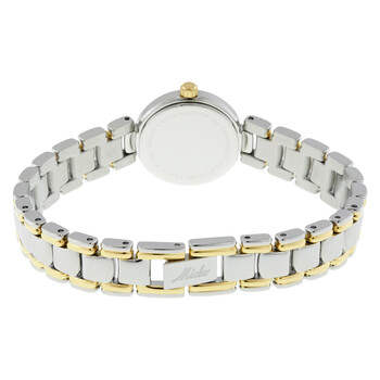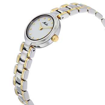 Stainless steel case with a two-tone (silver and gold-tone) stainless steel bracelet. Fixed stainless steel bezel. White dial with gold-tone hands and dot hour markers. Dial Type: Analog. ETA 901.001 quartz movement. Scratch resistant sapphire crystal. Pull / push crown. Solid case back. Case size: 21.5 mm. Case thickness: 5.30 mm. Round case shape. Band width: 5 mm. Water resistant at 30 meters / 100 feet. Functions: hour, minute. Dress watch style. Watch label: Swiss Made. Mido Romantique White Dial Ladies Watch M2132.9.16.1.