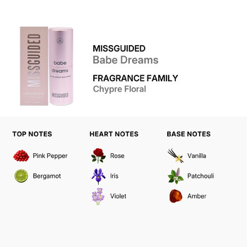 Babe Dreams opens with a playful burst of pink pepper and zesty bergamot, creating a bright and exciting first impression. As the scent unfolds, a dreamy heart of rose, iris, and violet takes center stage, adding a soft, feminine touch that feels both romantic and refreshing. Finally, a warm base of vanilla, patchouli, and amber wraps everything together, leaving a lasting trail that's cozy, confident, and undeniably alluring.