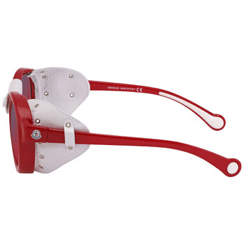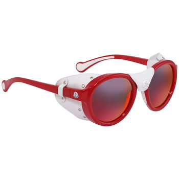 Moncler Sunglasses. Series number: ML0046. Color code: 67C. Shape: Round. Lens Width: 52 mm. Lens Bridge: 20 mm. Arm Length: 140 mm. 100% UV protection. Frame Material: Plastic. Frame Color: Matte Red;White;Leather. Lenses Type: Red Mirror. Rim Style: Full-Rim. UPC/EAN code: 664689925353. Moncler Red Mirror Round Unisex Sunglasses ML0046 67C 52.