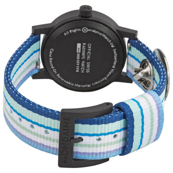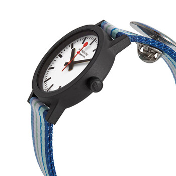 Black (renewable) plastic resin case with a black and white stripe resin (cork backed) strap. Fixed black (renewable) plastic resin bezel. White dial with black hands and index hour markers. Minute markers around the outer rim. Dial Type: Analog. RONDA 763E quartz movement. Scratch resistant mineral crystal. Pull / push crown. Solid case back. Round case shape. Case size: 32 mm. Case thickness: 7.8 mm. Band width: 16 mm. Tang clasp. Water resistant at 30 meters / 100 feet. Functions: hour, minute, second. Essence Series. Casual watch style. Watch label: Swiss Made. Mondaine Essence Quartz White Dial Ladies Watch MS1.32110.LQ.