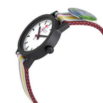 Black (bio-based) polyamide case with a striped (recycled PET) fabric (cork backed) strap. Fixed black (bio-based) polyamide bezel. White dial with black hands and index hour markers. Minute markers around the outer rim. Dial Type: Analog. Ronda Caliber 763E quartz movement. Scratch resistant hardened mineral crystal. Pull / push crown. Solid case back. Round case shape. Case size: 32 mm. Case thickness: 15 mm. Band width: 16 mm. Tang clasp. Water resistant at 30 meters / 100 feet. Functions: hour, minute, second. Essence Series. Casual watch style. Watch label: Swiss Movt. Mondaine Essence Quartz White Dial Ladies Watch MS1.32111.LG.