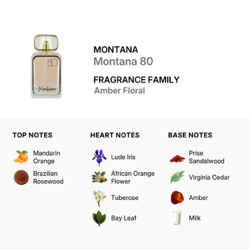 At first spritz, Montana 80 opens with vibrant top notes of juicy mandarin orange and rich Brazilian rosewood, creating a fresh yet deep introduction. As the fragrance settles, the heart unveils a graceful bouquet featuring African orange flower, lude iris, tuberose, and a touch of spicy bay leaf. This floral middle is both feminine and bold, creating a beautifully layered scent experience.